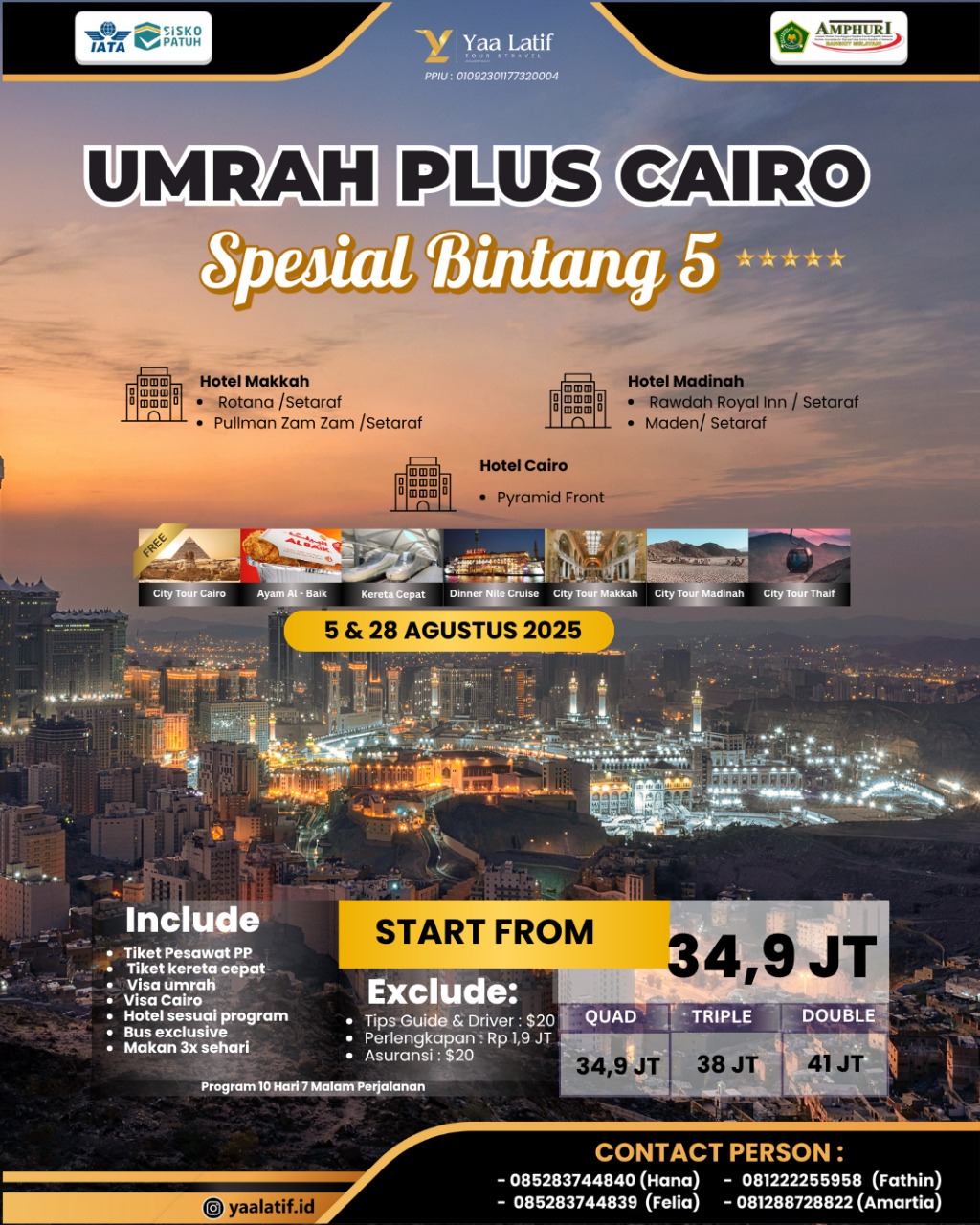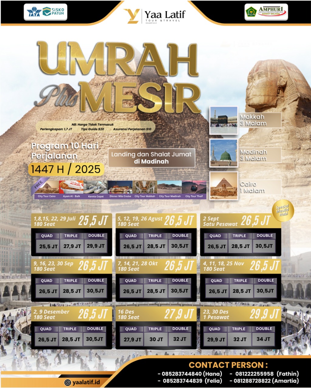 Sejak awal berdirinya, Yaa Latif Tour & Travel hadir sebagai sahabat perjalanan spiritual umat Muslim Indonesia. Dengan komitmen pada pelayanan yang amanah dan profesional, kami menawarkan berbagai paket umrah, haji dan wisata halal yang dirancang untuk memberikan kenyamanan, ketenangan, dan pengalaman ibadah yang khusyuk.