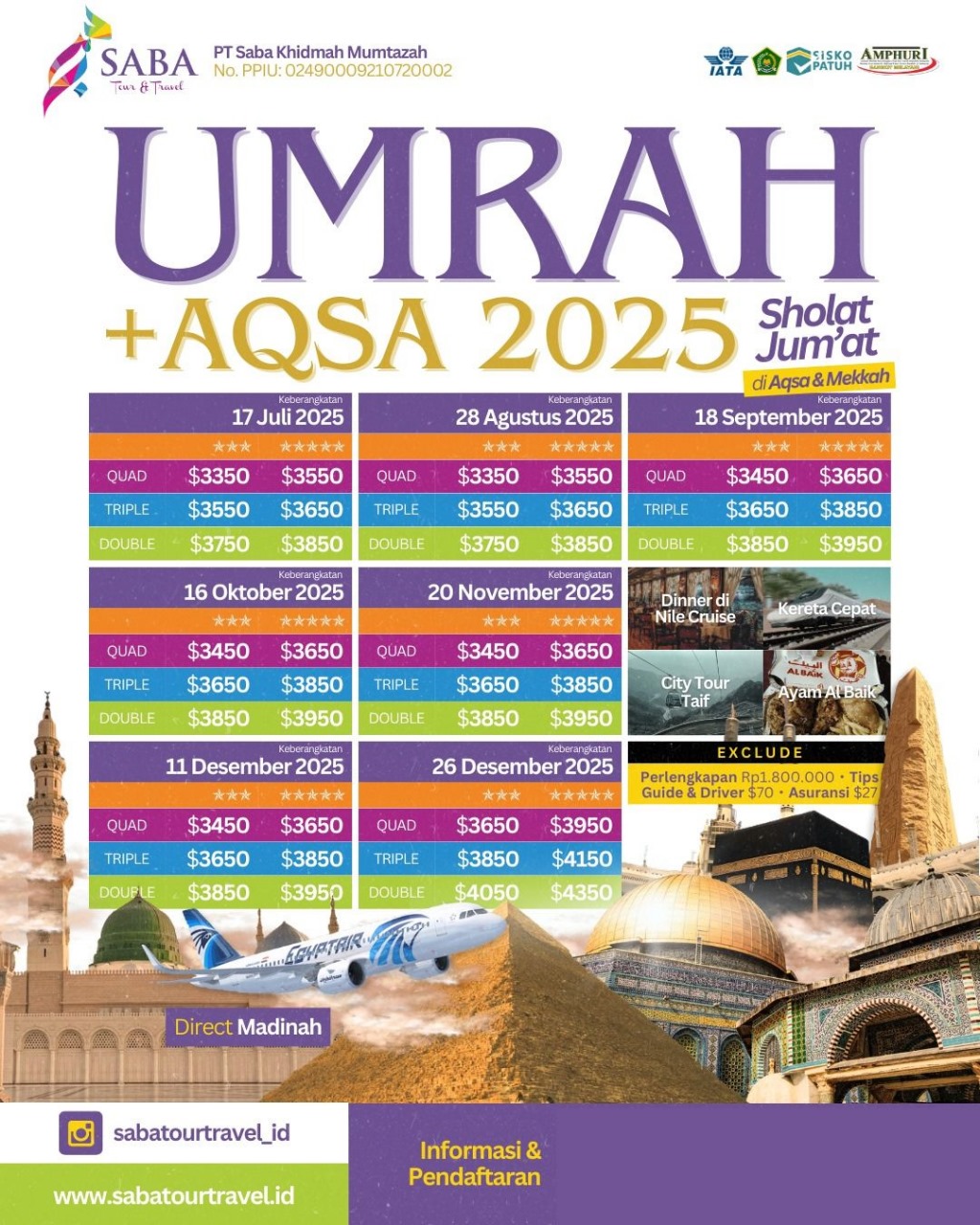 Lewati ke kontenBerikut merupakan varian paket umroh Yaa Latif Tour & Travel, silahkan pilih sesuai dengan kebutuhan Anda, jika ingin custom paket Anda bisa menghubungi customer service Kami.